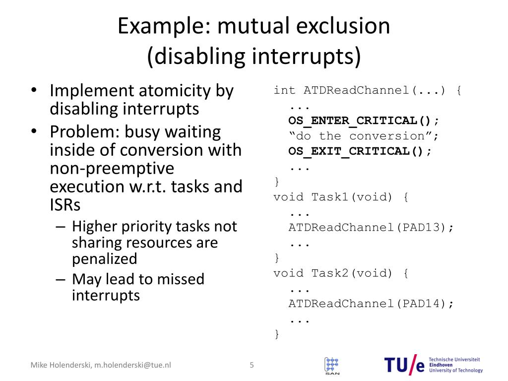 Example: mutual exclusion(disabling interrupts) intATDReadChannel(...) { ... OS_ENTER_CRITICAL(); “do the conversion”; OS_EXIT_CRITICAL(); ... } void Task1(void) { ... ATDReadChannel(PAD13); ... } void Task2(void) { ... ATDReadChannel(PAD14); ... } • Implement atomicity by disabling interrupts • Problem: busy waiting inside of conversion with non-preemptive execution w.r.t. tasks and ISRs • Higher priority tasks not sharing resources are penalized • May lead to missed interrupts