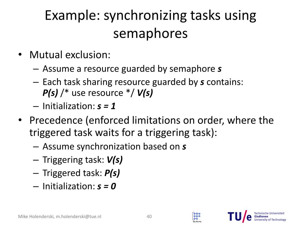 Example: synchronizing tasks using semaphores • Mutual exclusion: • Assume a resource guarded by semaphore s • Each task sharing resource guarded by s contains:P(s)/* use resource */ V(s) • Initialization: s = 1 • Precedence (enforced limitations on order, where the triggered task waits for a triggering task): • Assume synchronization based on s • Triggering task: V(s) • Triggered task: P(s) • Initialization:s = 0