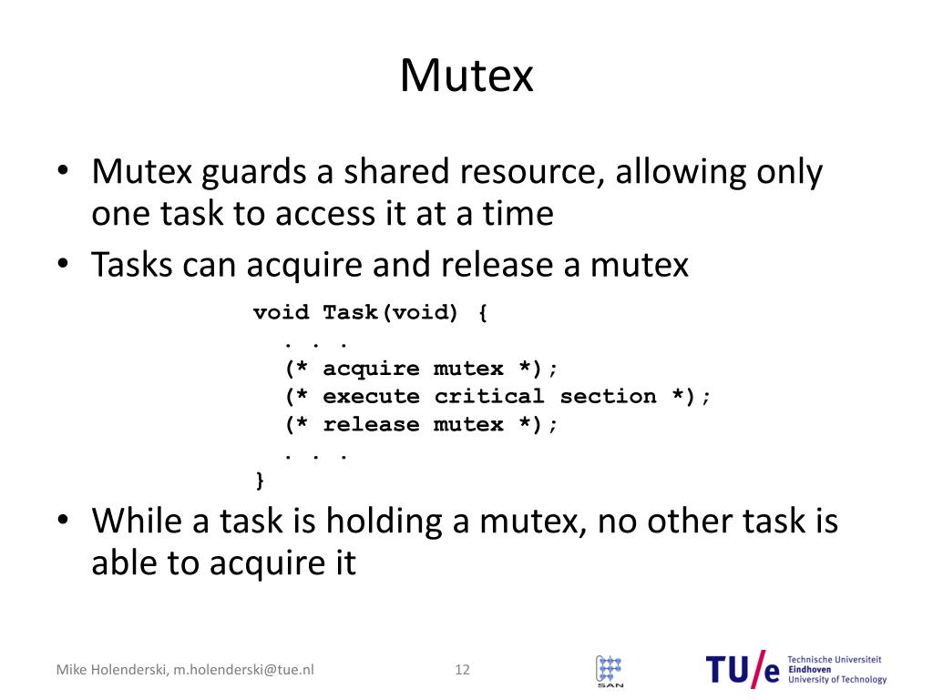 Mutex • void Task(void) { • . . . • (* acquire mutex *); • (* execute critical section *); • (* release mutex *); • . . . • } Mutex guards a shared resource, allowing only one task to access it at a time Tasks can acquire and release a mutex While a task is holding a mutex, no other task is able to acquire it