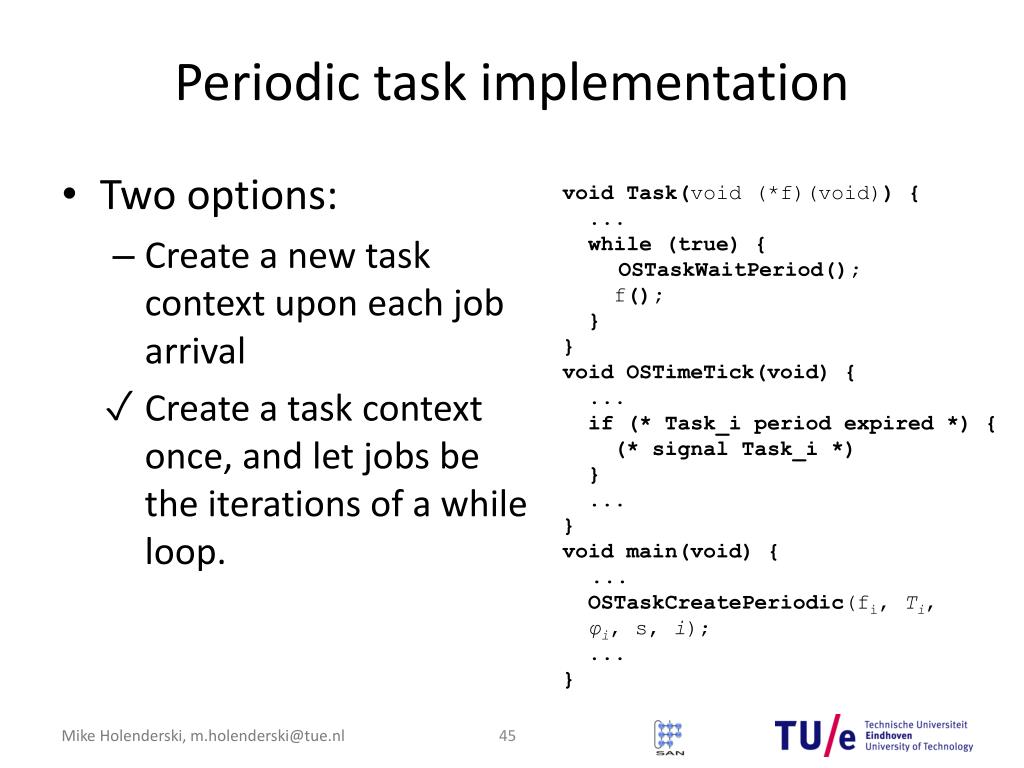 Periodic task implementation • void Task(void (*f)(void)) { • ... • while (true) { • OSTaskWaitPeriod(); • f(); • } • } • void OSTimeTick(void) { • ... • if (* Task_i period expired *) { • (* signal Task_i *) • } • ... • } • void main(void) { • ... • OSTaskCreatePeriodic(fi, Ti, • φi, s, i); • ... • } ✓ • Two options: • Create a new task context upon each job arrival • Create a task context once, and let jobs be the iterations of a while loop.