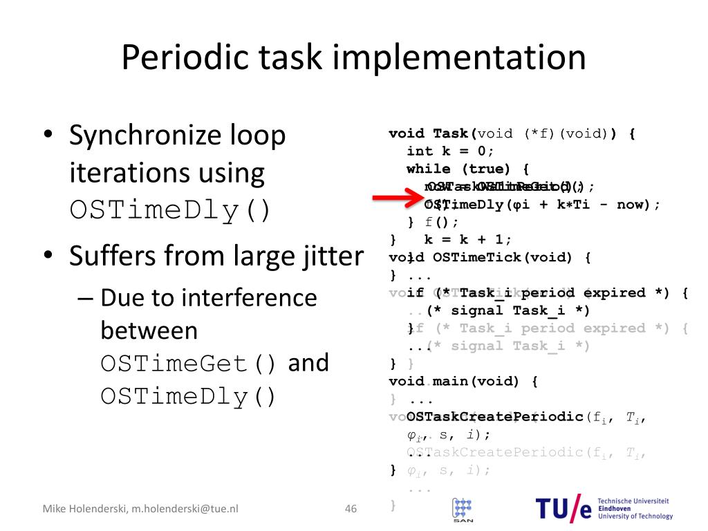 Periodic task implementation • void Task(void (*f)(void)) { • intk = 0; • while (true) { • now = OSTimeGet(); • OSTimeDly(φi + k∗Ti - now); • f(); • k = k + 1; • } • } • void OSTimeTick(void) { • ... • if (* Task_i period expired *) { • (* signal Task_i *) • } • ... • } • void main(void) { • ... • OSTaskCreatePeriodic(fi, Ti, • φi, s, i); • ... • } • void Task(void (*f)(void)) { • ... • while (true) { • OSTaskWaitPeriod(); • f(); • } • } • void OSTimeTick(void) { • ... • if (* Task_i period expired *) { • (* signal Task_i *) • } • ... • } • void main(void) { • ... • OSTaskCreatePeriodic(fi, Ti, • φi, s, i); • ... • } • Synchronize loop iterations using OSTimeDly() • Suffers from large jitter • Due to interference between OSTimeGet() and OSTimeDly()