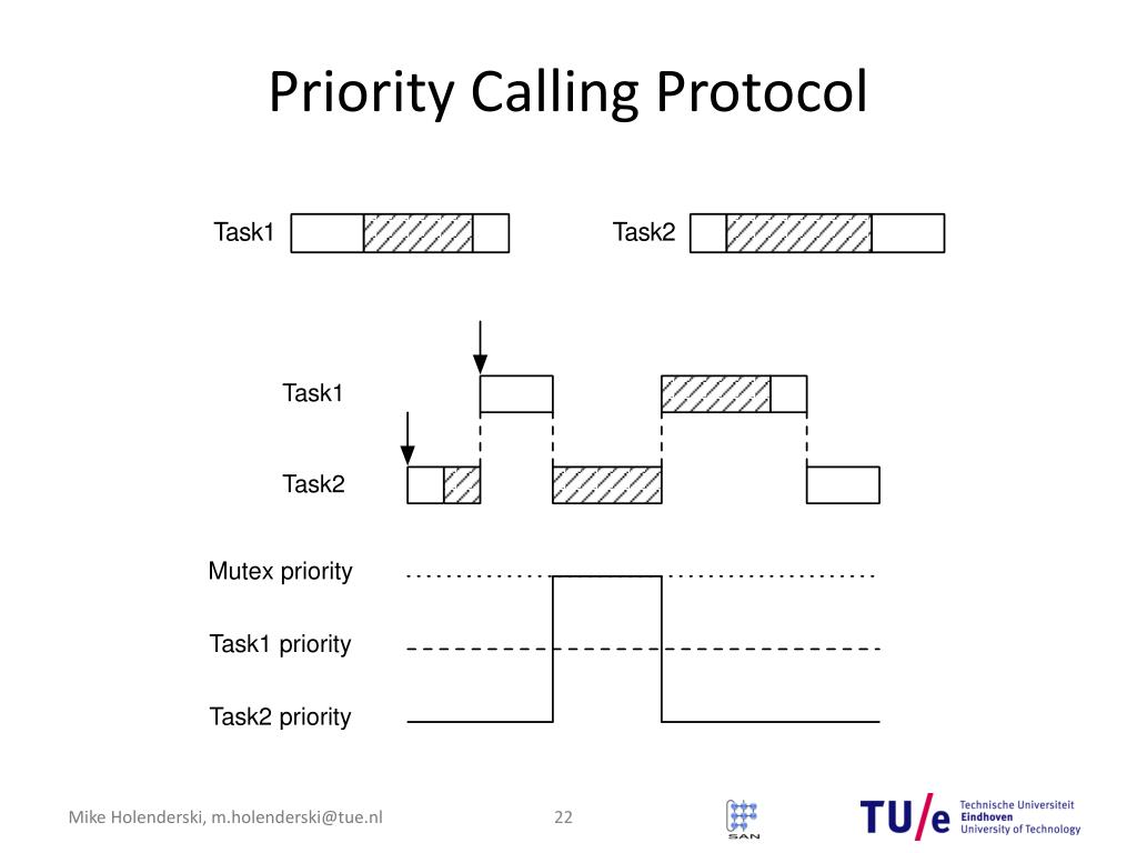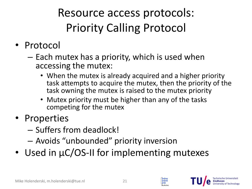 Resource access protocols:Priority Calling Protocol • Protocol • Each mutex has a priority, which is used when accessing the mutex: • When the mutex is already acquired and a higher priority task attempts to acquire the mutex, then the priority of the task owning the mutex is raised to the mutex priority • Mutex priority must be higher than any of the tasks competing for the mutex • Properties • Suffers from deadlock! • Avoids “unbounded” priority inversion • Used in μC/OS-II for implementing mutexes