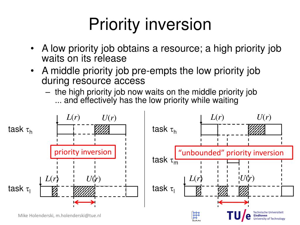 Priority inversion • A low priority job obtains a resource; a high priority job waits on its release • A middle priority job pre-empts the low priority job during resource access • the high priority job now waits on the middle priority job... and effectively has the low priority while waiting L(r) U(r) U(r) task h task h L(r) priority inversion “unbounded” priority inversion task m U(r) L(r) task l task l U(r) L(r)