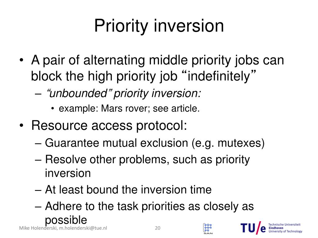 Priority inversion • A pair of alternating middle priority jobs can block the high priority job “indefinitely” • “unbounded” priority inversion: • example: Mars rover; see article. • Resource access protocol: • Guarantee mutual exclusion (e.g. mutexes) • Resolve other problems, such as priority inversion • At least bound the inversion time • Adhere to the task priorities as closely as possible