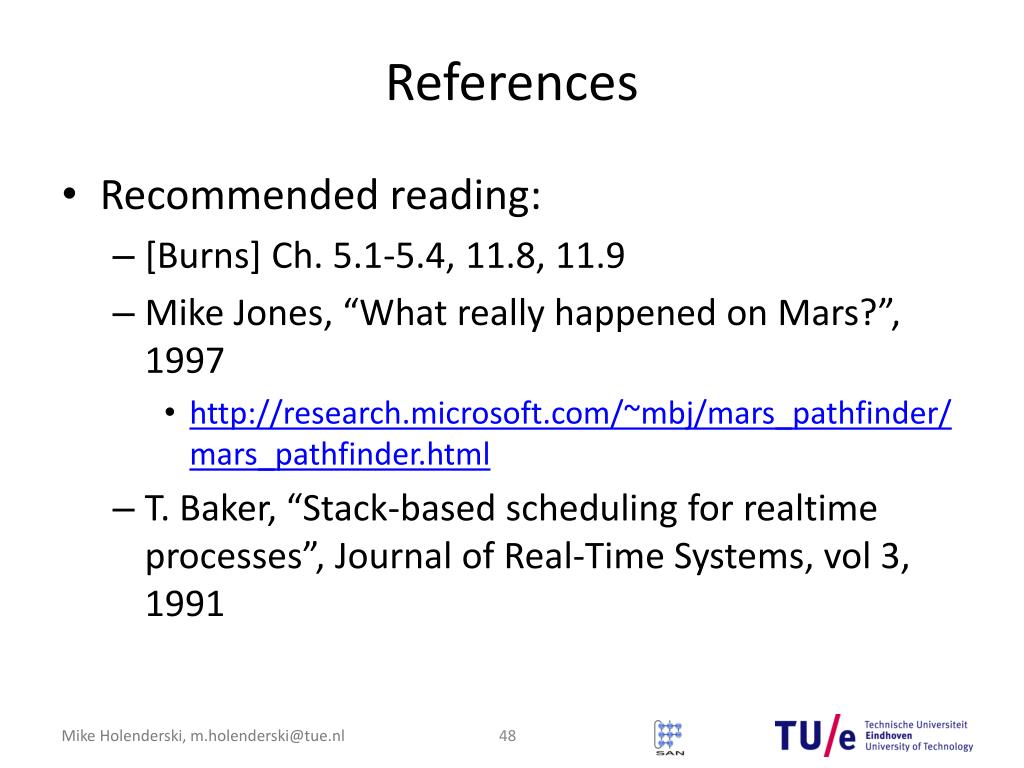 References • Recommended reading: • [Burns] Ch. 5.1-5.4, 11.8, 11.9 • Mike Jones, “What really happened on Mars?”, 1997 • http://research.microsoft.com/~mbj/mars_pathfinder/mars_pathfinder.html • T. Baker, “Stack-based scheduling for realtime processes”, Journal of Real-Time Systems, vol 3, 1991