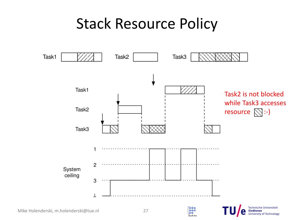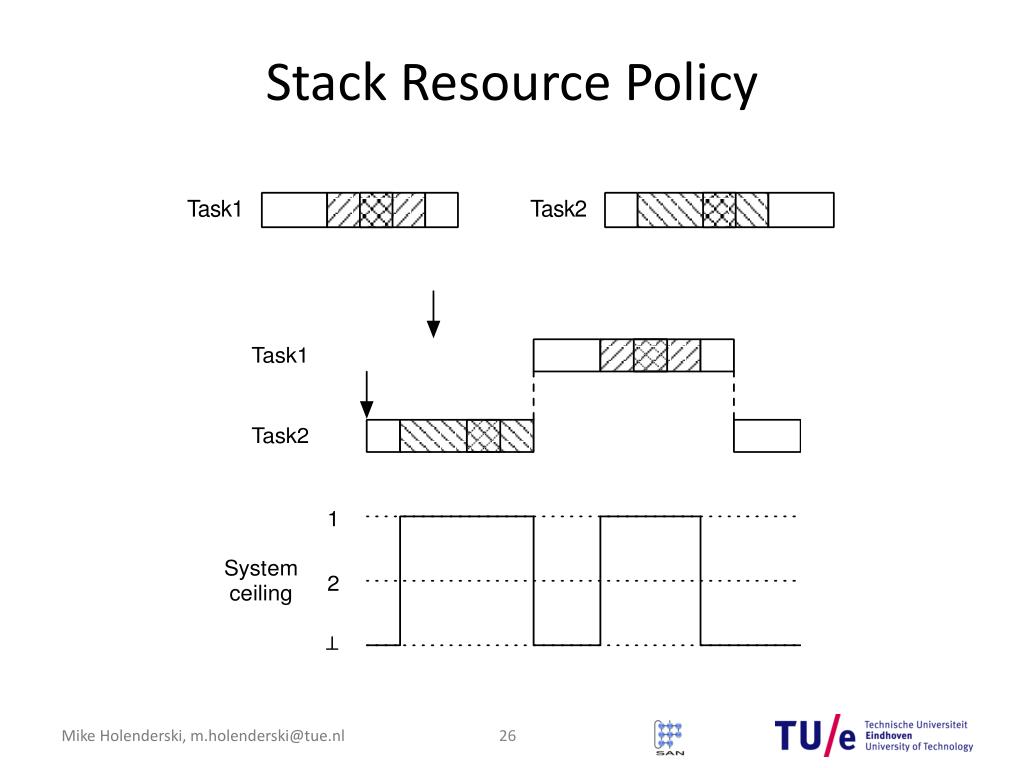 Resource access protocols:Stack Resource Policy (SRP) • Protocol • Assign to each mutex a ceiling, equal (or higher) to the maximum priority of any task that can acquire it • Scheduler keeps track of the system ceiling, equal to the maximum ceiling of any mutexcurrently acquired by any task • A task can only start executing if • it has the highest priority among ready tasks, and • its priority is higher than the current system ceiling