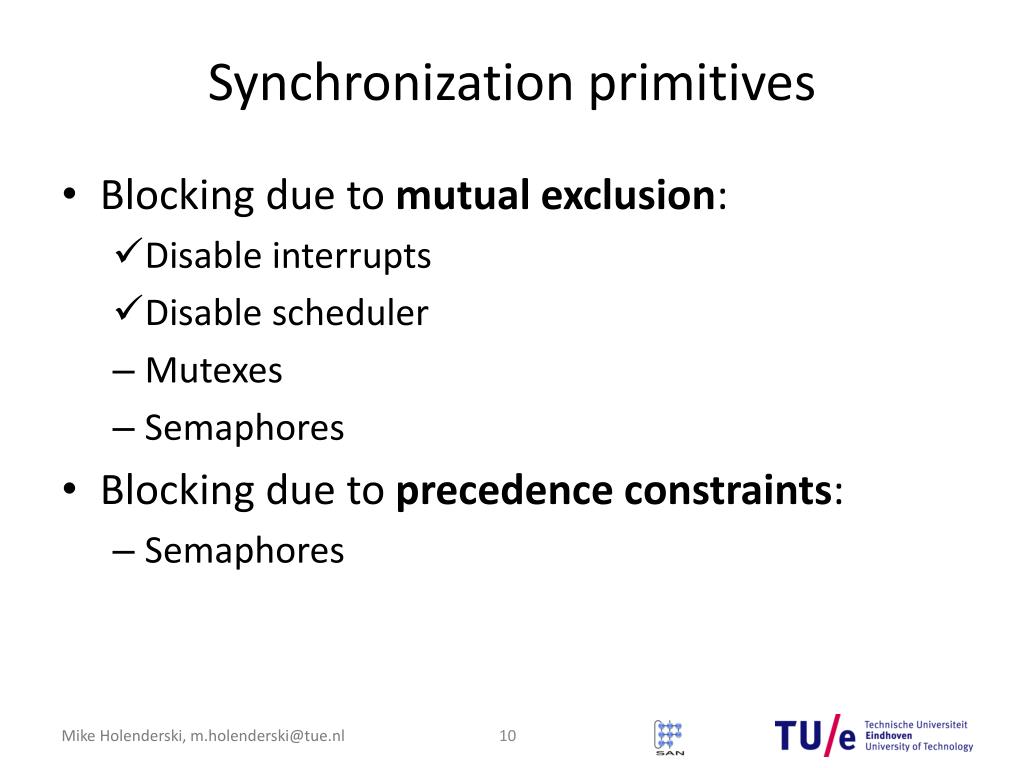 Synchronization primitives • Blocking due to mutual exclusion: • Disable interrupts • Disable scheduler • Mutexes • Semaphores • Blocking due to precedence constraints: • Semaphores