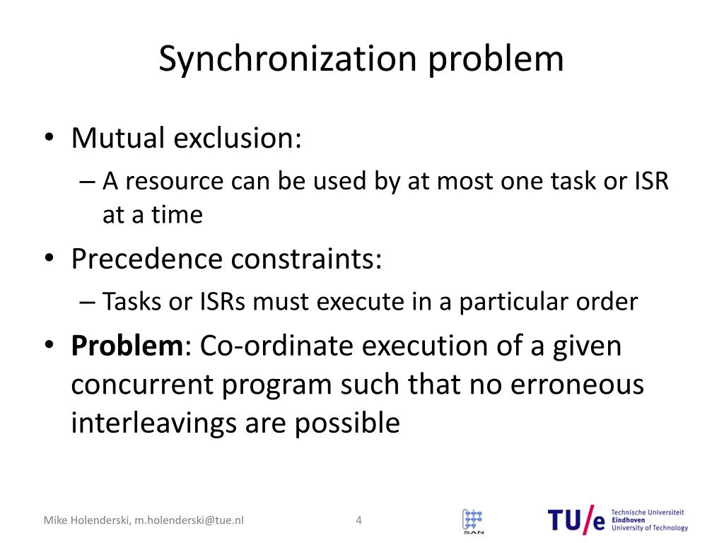 Synchronization problem • Mutual exclusion: • A resource can be used by at most one task or ISR at a time • Precedence constraints: • Tasks or ISRs must execute in a particular order • Problem:Co-ordinate execution of a given concurrent program such that no erroneous interleavings are possible