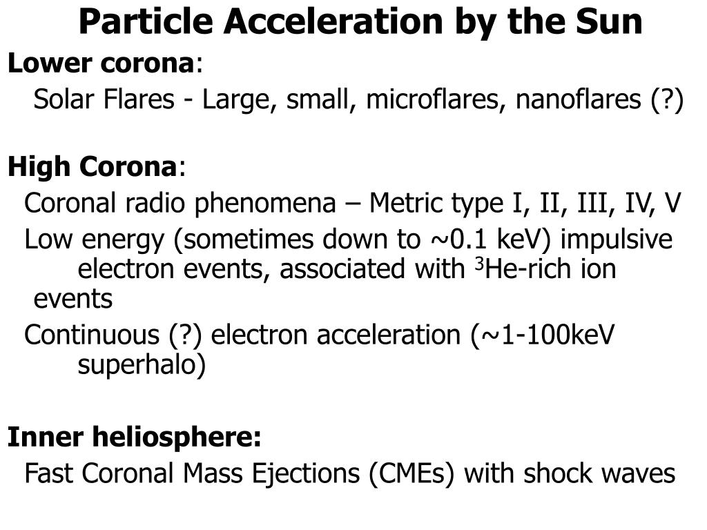 Particle Acceleration by the Sun Lower corona: Solar Flares - Large, small, microflares, nanoflares (?) High Corona: Coronal radio phenomena – Metric type I, II, III, IV, V Low energy (sometimes down to ~0.1 keV) impulsive electron events, associated with 3He-rich ion events Continuous (?) electron acceleration (~1-100keV superhalo) Inner heliosphere: Fast Coronal Mass Ejections (CMEs) with shock waves