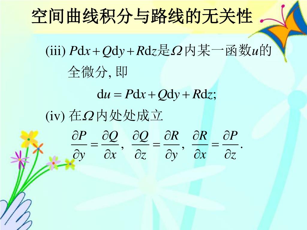 空间曲线积分与路线的无关性 (iii) PdxQdyRdz是内某一函数u的 全微分, 即 (iv) 在内处处成立