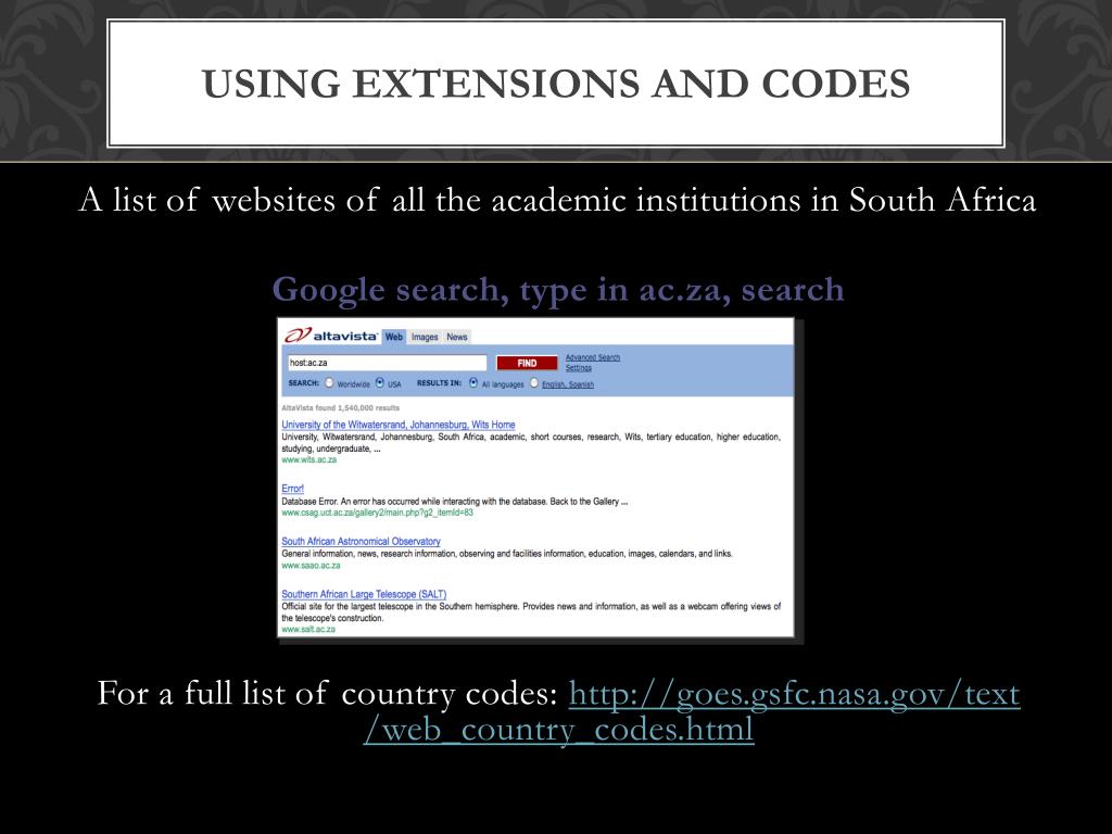 Using Extensions and Codes A list of websites of all the academic institutions in South Africa Google search, type in ac.za, search For a full list of country codes: http://goes.gsfc.nasa.gov/text /web_country_codes.html