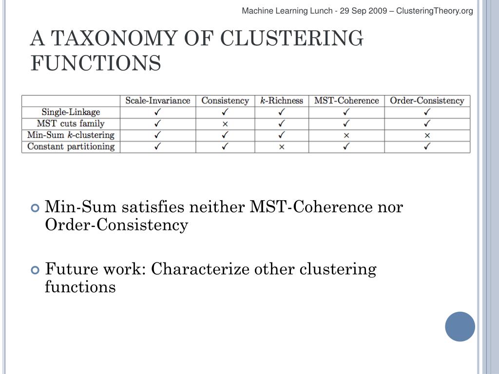 A TAXONOMY OF CLUSTERING FUNCTIONS • Min-Sum satisfies neither MST-Coherence nor Order-Consistency • Future work: Characterize other clustering functions