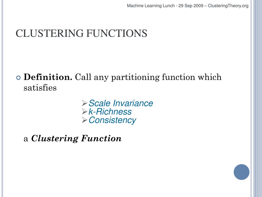 CLUSTERING FUNCTIONS • Definition. Call any partitioning function which satisfies a Clustering Function • Scale Invariance • k-Richness • Consistency