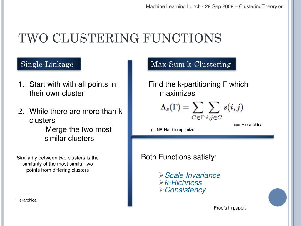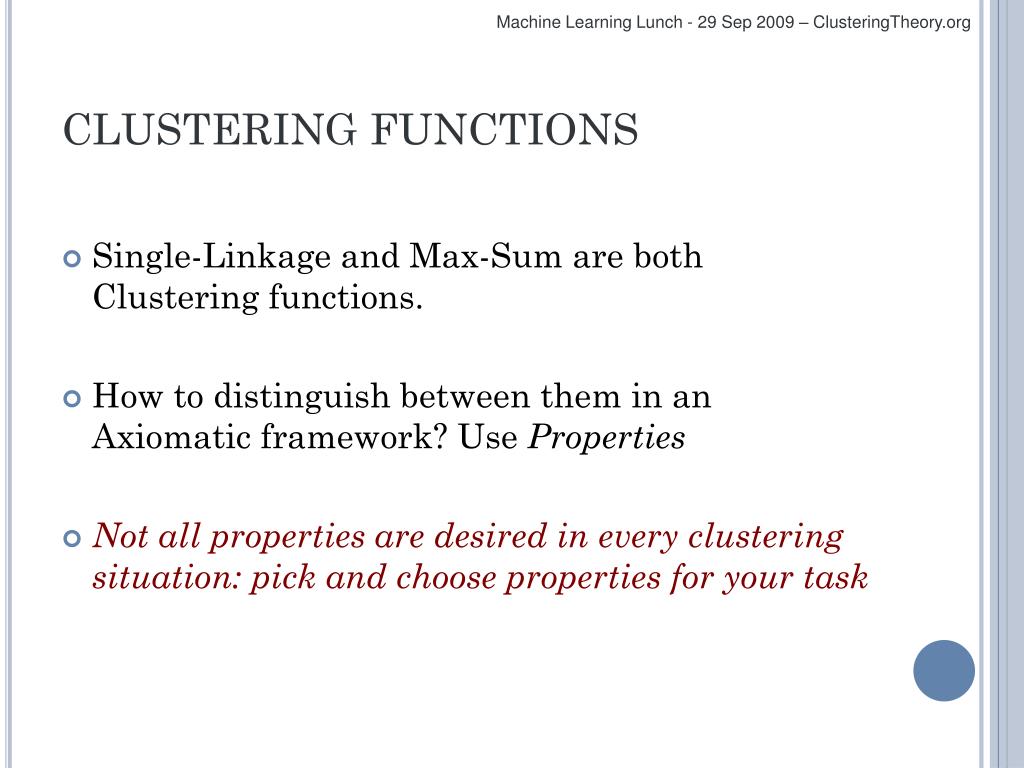 CLUSTERING FUNCTIONS • Single-Linkage and Max-Sum are both Clustering functions. • How to distinguish between them in an Axiomatic framework? Use Properties • Not all properties are desired in every clustering situation: pick and choose properties for your task