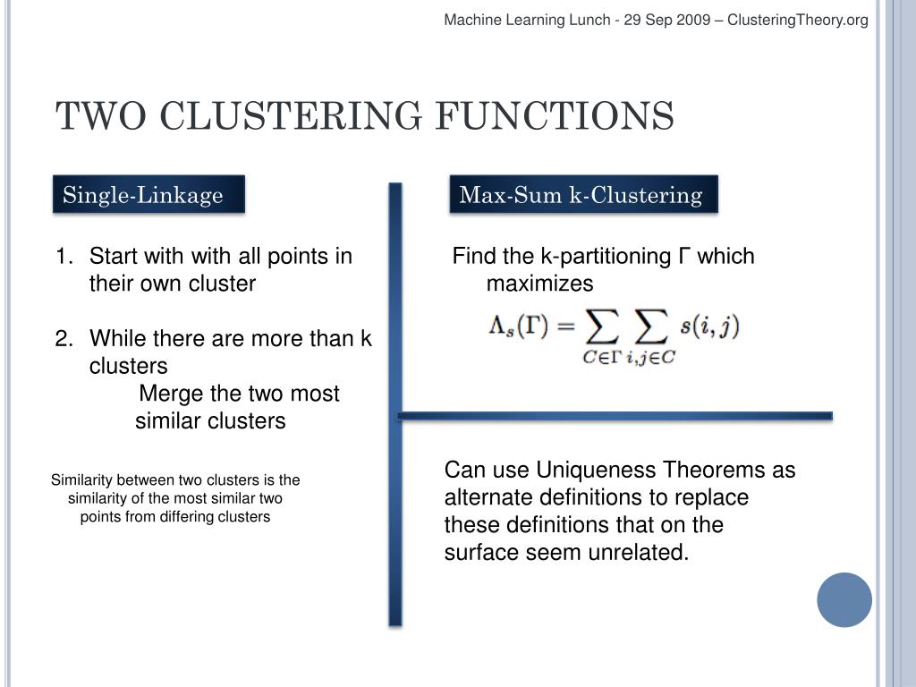 TWO CLUSTERING FUNCTIONS Single-Linkage Max-Sum k-Clustering • Start with with all points in their own cluster • While there are more than k clusters • Merge the two most similar clusters Find the k-partitioning Γ which maximizes Can use Uniqueness Theorems as alternate definitions to replace these definitions that on the surface seem unrelated. Similarity between two clusters is the similarity of the most similar two points from differing clusters