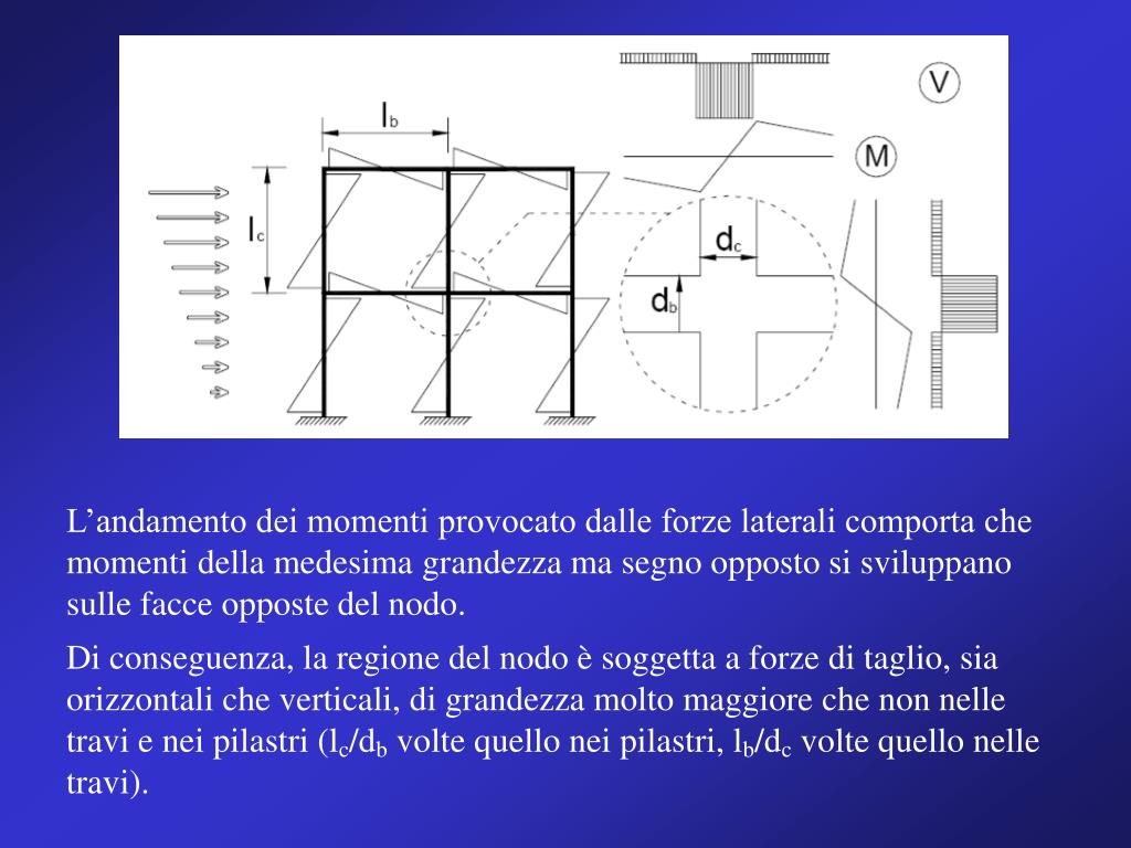 L’andamento dei momenti provocato dalle forze laterali comporta che momenti della medesima grandezza ma segno opposto si sviluppano sulle facce opposte del nodo. Di conseguenza, la regione del nodo è soggetta a forze di taglio, sia orizzontali che verticali, di grandezza molto maggiore che non nelle travi e nei pilastri (lc/db volte quello nei pilastri, lb/dc volte quello nelle travi).
