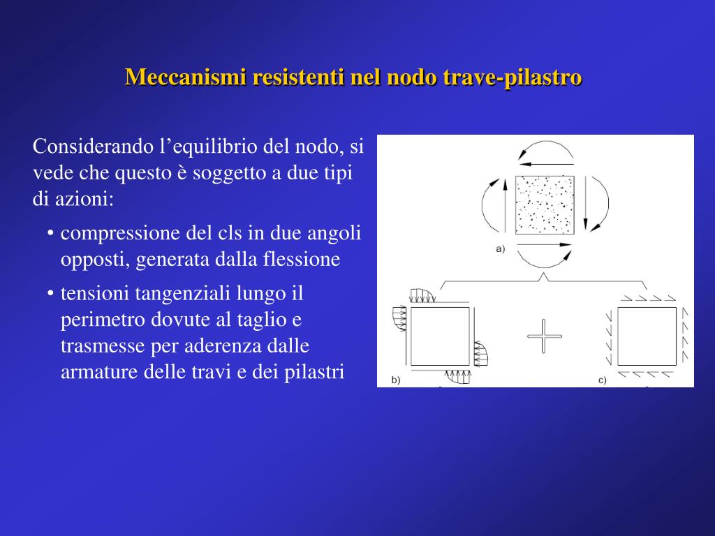 Meccanismi resistenti nel nodo trave-pilastro • Considerando l’equilibrio del nodo, si vede che questo è soggetto a due tipi di azioni: • compressione del cls in due angoli opposti, generata dalla flessione • tensioni tangenziali lungo il perimetro dovute al taglio e trasmesse per aderenza dalle armature delle travi e dei pilastri