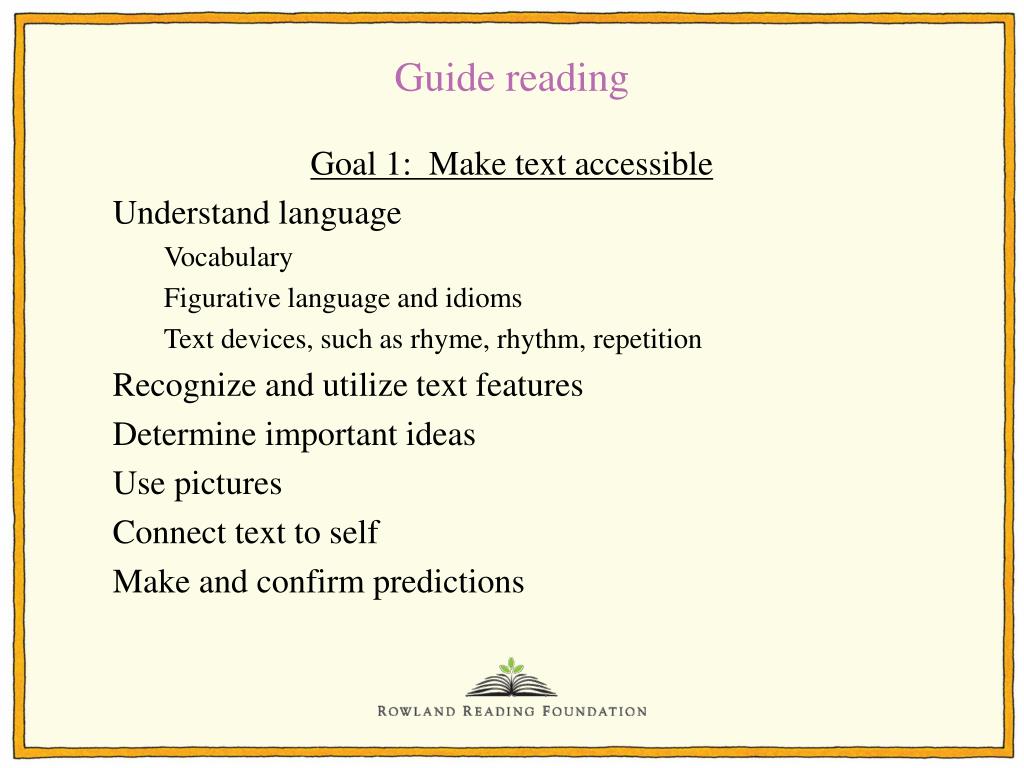 Guide reading Goal 1: Make text accessible Understand language Vocabulary Figurative language and idioms Text devices, such as rhyme, rhythm, repetition Recognize and utilize text features Determine important ideas Use pictures Connect text to self Make and confirm predictions