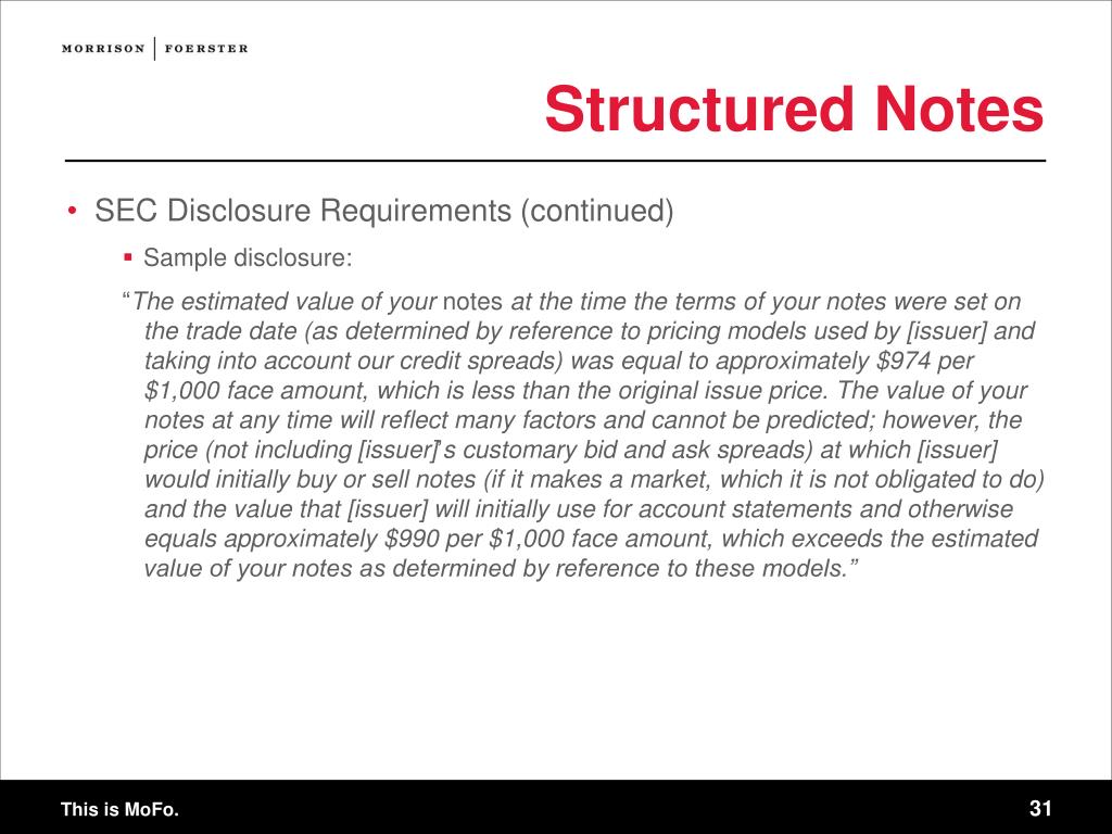 Structured Notes • SEC Disclosure Requirements (continued) • Sample disclosure: “The estimated value of your notes at the time the terms of your notes were set on the trade date (as determined by reference to pricing models used by [issuer] and taking into account our credit spreads) was equal to approximately $974 per $1,000 face amount, which is less than the original issue price. The value of your notes at any time will reflect many factors and cannot be predicted; however, the price (not including [issuer]’s customary bid and ask spreads) at which [issuer] would initially buy or sell notes (if it makes a market, which it is not obligated to do) and the value that [issuer] will initially use for account statements and otherwise equals approximately $990 per $1,000 face amount, which exceeds the estimated value of your notes as determined by reference to these models.”