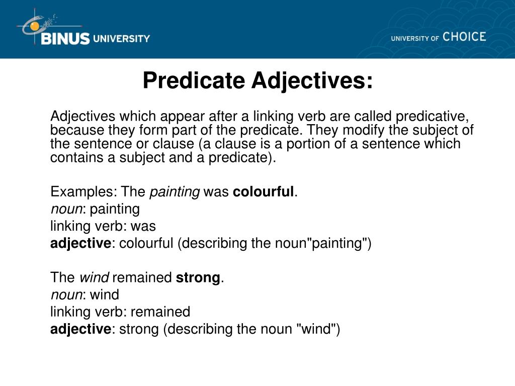 Predicate Adjectives: Adjectives which appear after a linking verb are called predicative, because they form part of the predicate. They modify the subject of the sentence or clause (a clause is a portion of a sentence which contains a subject and a predicate). Examples: The painting was colourful. noun: painting linking verb: was adjective: colourful (describing the noun"painting") The wind remained strong. noun: wind linking verb: remained adjective: strong (describing the noun "wind")