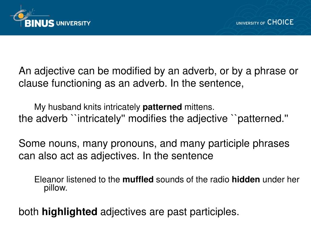 An adjective can be modified by an adverb, or by a phrase or clause functioning as an adverb. In the sentence, My husband knits intricately patterned mittens. the adverb ``intricately'' modifies the adjective ``patterned.'' Some nouns, many pronouns, and many participle phrases can also act as adjectives. In the sentence Eleanor listened to the muffled sounds of the radio hidden under her pillow. both highlighted adjectives are past participles.