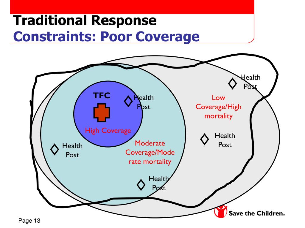 Traditional ResponseConstraints: Poor Coverage Health Post TFC Health Post Low Coverage/High mortality High Coverage Health Post Moderate Coverage/Moderate mortality Health Post Health Post