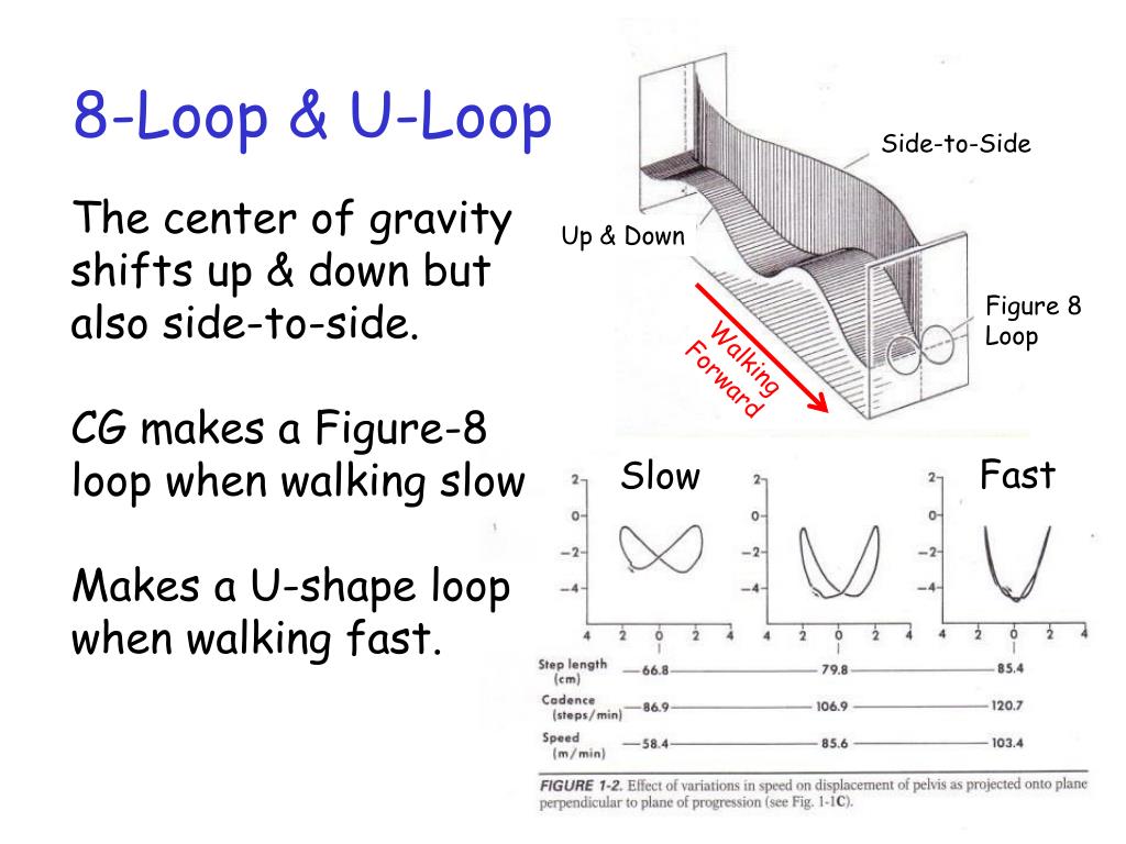 8-Loop & U-Loop Side-to-Side The center of gravity shifts up & down but also side-to-side. CG makes a Figure-8 loop when walking slow Makes a U-shape loop when walking fast. Up & Down Figure 8Loop Walking Forward Fast Slow
