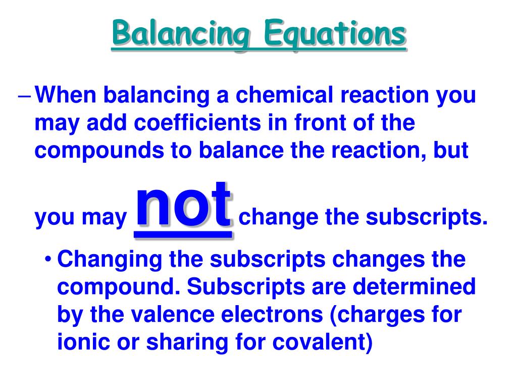 Balancing Equations • When balancing a chemical reaction you may add coefficients in front of the compounds to balance the reaction, but you may not change the subscripts. • Changing the subscripts changes the compound. Subscripts are determined by the valence electrons (charges for ionic or sharing for covalent)
