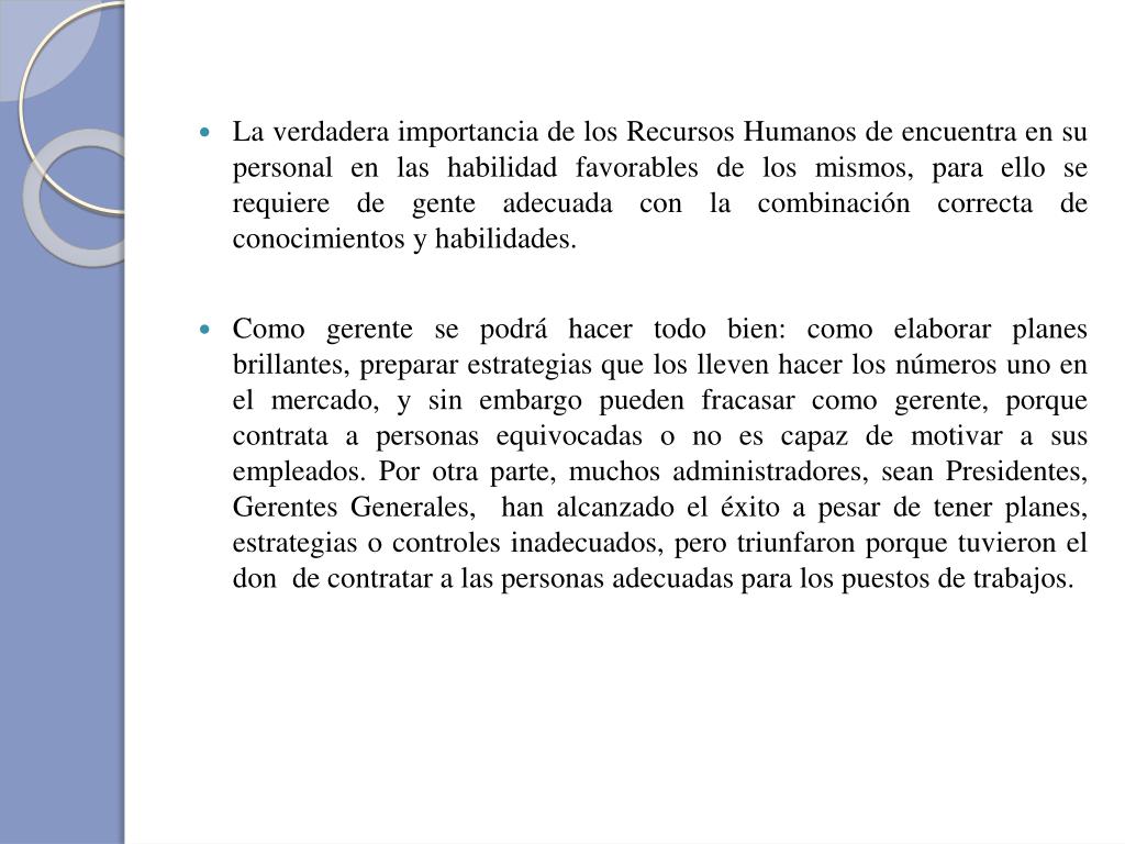 La verdadera importancia de los Recursos Humanos de encuentra en su personal en las habilidad favorables de los mismos, para ello se requiere de gente adecuada con la combinación correcta de conocimientos y habilidades. • Como gerente se podrá hacer todo bien: como elaborar planes brillantes, preparar estrategias que los lleven hacer los números uno en el mercado, y sin embargo pueden fracasar como gerente, porque contrata a personas equivocadas o no es capaz de motivar a sus empleados. Por otra parte, muchos administradores, sean Presidentes, Gerentes Generales, han alcanzado el éxito a pesar de tener planes, estrategias o controles inadecuados, pero triunfaron porque tuvieron el don de contratar a las personas adecuadas para los puestos de trabajos.