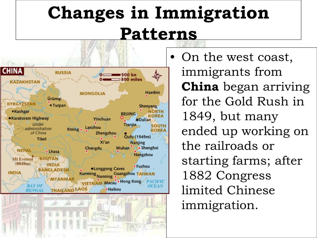 Changes in Immigration Patterns • On the west coast, immigrants from China began arriving for the Gold Rush in 1849, but many ended up working on the railroads or starting farms; after 1882 Congress limited Chinese immigration.
