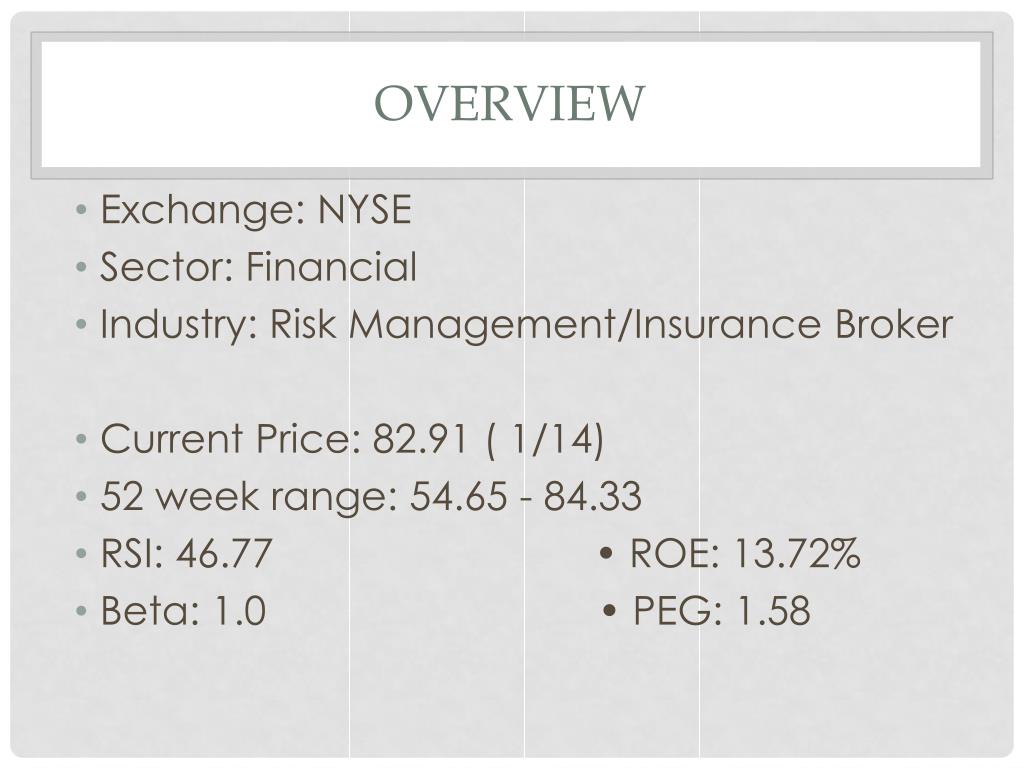 Overview • Exchange: NYSE • Sector: Financial • Industry: Risk Management/Insurance Broker • Current Price: 82.91 ( 1/14) • 52 week range: 54.65 - 84.33 • RSI: 46.77 • ROE: 13.72% • Beta: 1.0 • PEG: 1.58