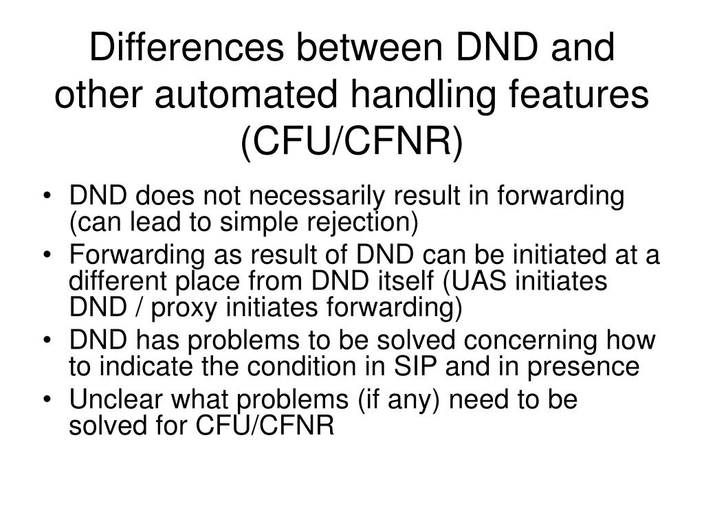 Differences between DND and other automated handling features (CFU/CFNR) • DND does not necessarily result in forwarding (can lead to simple rejection) • Forwarding as result of DND can be initiated at a different place from DND itself (UAS initiates DND / proxy initiates forwarding) • DND has problems to be solved concerning how to indicate the condition in SIP and in presence • Unclear what problems (if any) need to be solved for CFU/CFNR
