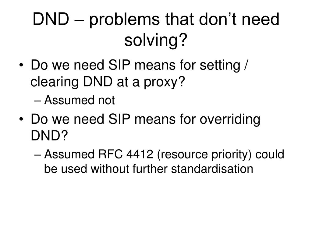 DND – problems that don’t need solving? • Do we need SIP means for setting / clearing DND at a proxy? • Assumed not • Do we need SIP means for overriding DND? • Assumed RFC 4412 (resource priority) could be used without further standardisation