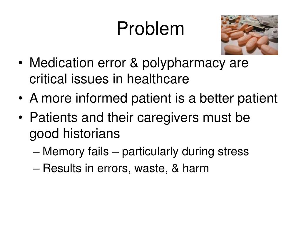 Problem • Medication error & polypharmacy are critical issues in healthcare • A more informed patient is a better patient • Patients and their caregivers must be good historians • Memory fails – particularly during stress • Results in errors, waste, & harm