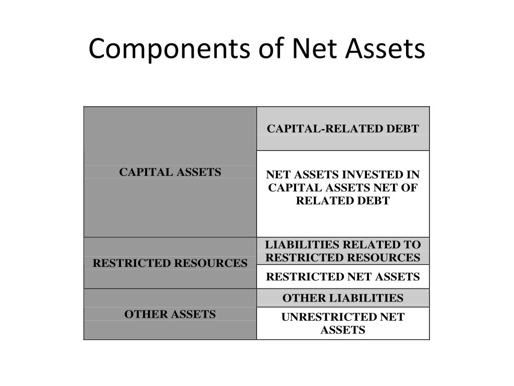 How are Net Assets Reported? • Presentation based on accessibility of underlying assets • Net investment in capital assets • Restricted • Unrestricted