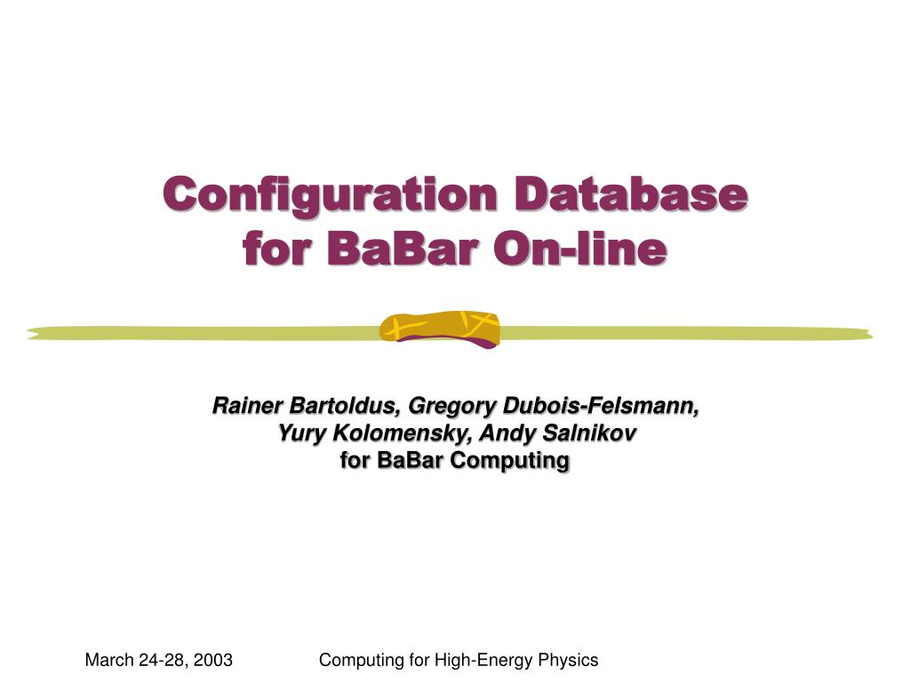 Configuration Database for BaBar On-line. Rainer Bartoldus, Gregory Dubois-Felsmann, Yury Kolomensky, Andy Salnikov for BaBar Computing. On-line Databases. Conditions database Calibrations, geometry, alignment, etc. Data accessed with the event time Ambient database (simplified conditions)