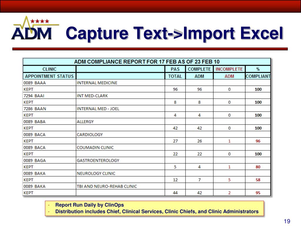 Capture Text->Import Excel • Report Run Daily by ClinOps • Distribution includes Chief, Clinical Services, Clinic Chiefs, and Clinic Administrators