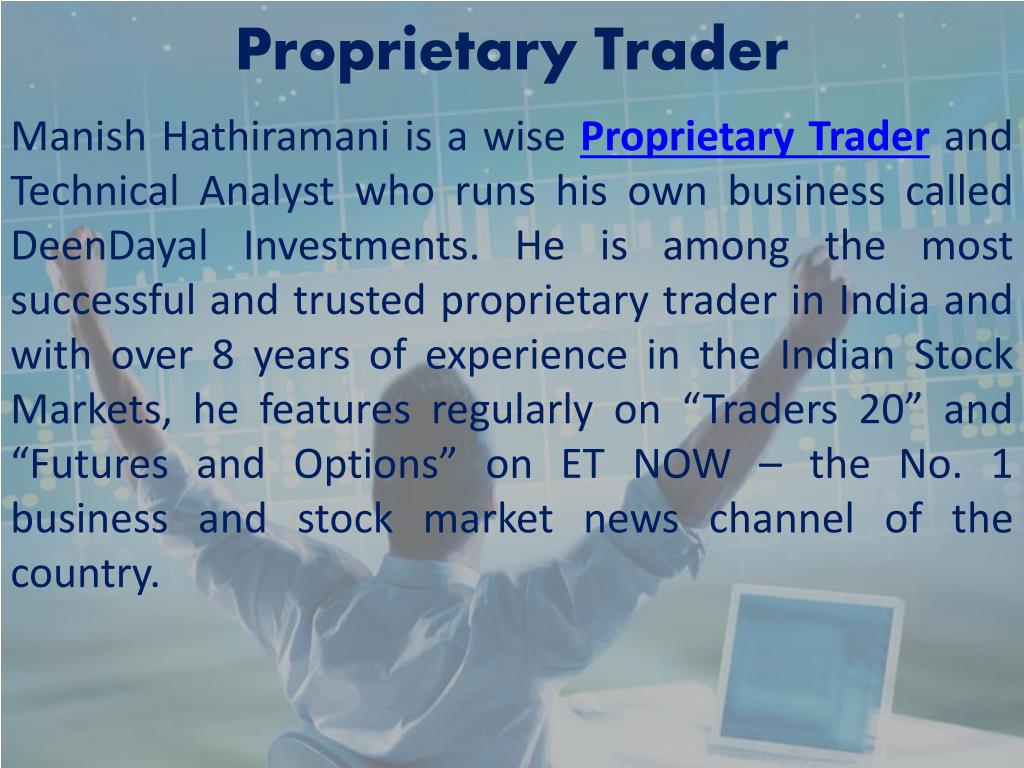 Proprietary Trader Manish Hathiramani is a wise Proprietary Trader and Technical Analyst who runs his own business called DeenDayal Investments. He is among the most successful and trusted proprietary trader in India and with over 8 years of experience in the Indian Stock Markets, he features regularly on “Traders 20” and “Futures and Options” on ET NOW – the No. 1 business and stock market news channel of the country.