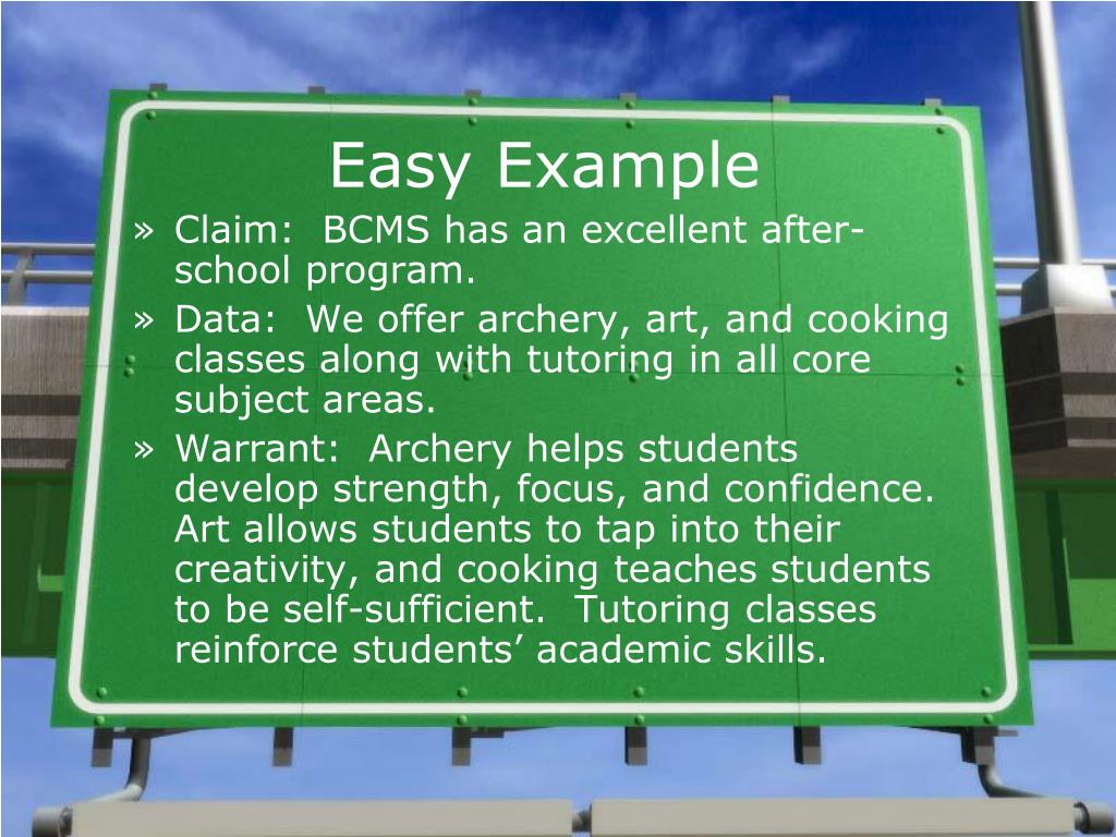 Easy Example • Claim: BCMS has an excellent after-school program. • Data: We offer archery, art, and cooking classes along with tutoring in all core subject areas. • Warrant: Archery helps students develop strength, focus, and confidence. Art allows students to tap into their creativity, and cooking teaches students to be self-sufficient. Tutoring classes reinforce students’ academic skills.