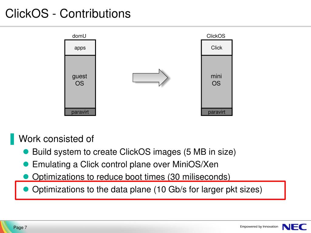domU ClickOS apps Click guest OS mini OS paravirt paravirt ClickOS - Contributions • Work consisted of • Build system to create ClickOS images (5 MB in size) • Emulating a Click control plane over MiniOS/Xen • Optimizations to reduce boot times (30 miliseconds) • Optimizations to the data plane (10 Gb/s for larger pkt sizes) Page 7
