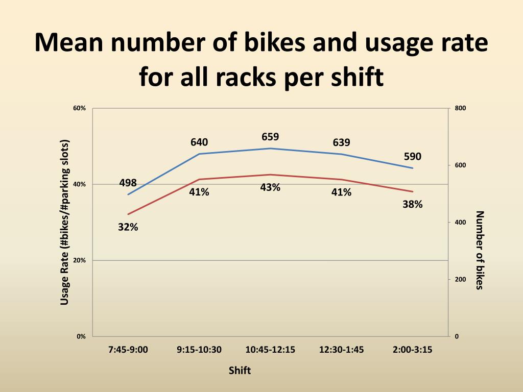 Mean number of bikes and usage rate for all racks per shift Number of bikes Shift
