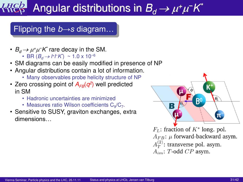 Angular distributions in Bd +−K* Flipping the b→sdiagram… • Bd +−K* rare decay in the SM. • BR (Bd l+l−K*) ~ 1.0 x 10−6 • SM diagrams can be easily modified in presence of NP • Angular distributions contain a lot of information. • Many observables probe helicity structure of NP • Zero crossing point of AFB(q2) well predictedin SM • Hadronic uncertainties are minimized • Measures ratio Wilson coefficients C9/C7. • Sensitive to SUSY, graviton exchanges, extra dimensions… Status and physics at LHCb, Jeroen van Tilburg