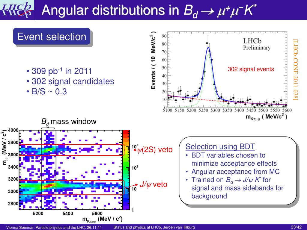 Angular distributions in Bd +−K* Event selection 302 signal events • 309 pb-1 in 2011 • 302 signal candidates • B/S ~ 0.3 [LHCb-CONF-2011-038] Bd mass window • Selection using BDT • BDT variables chosen to minimize acceptance effects • Angular acceptance from MC • Trained on Bd J/K* for signal and mass sidebands for background (2S) veto J/ veto Status and physics at LHCb, Jeroen van Tilburg