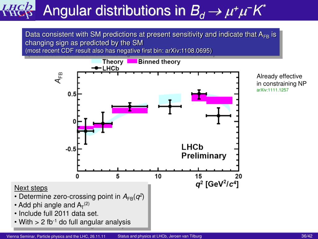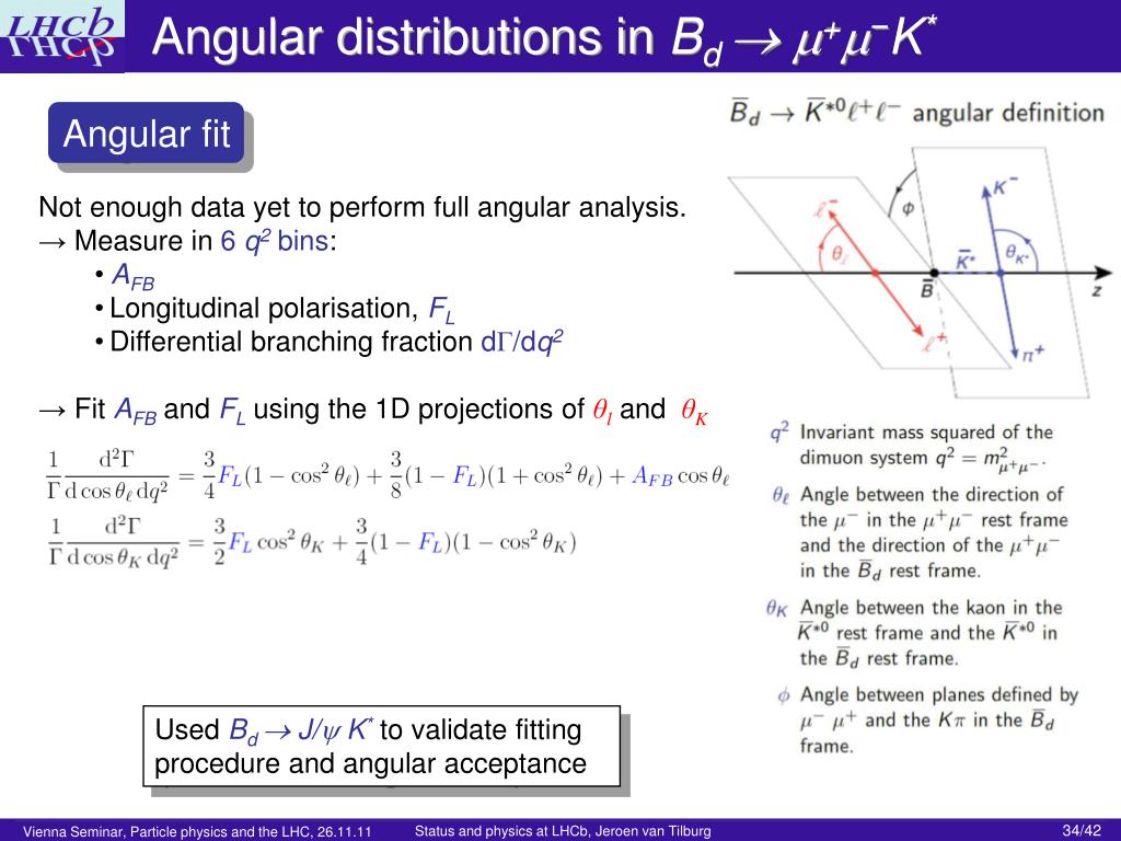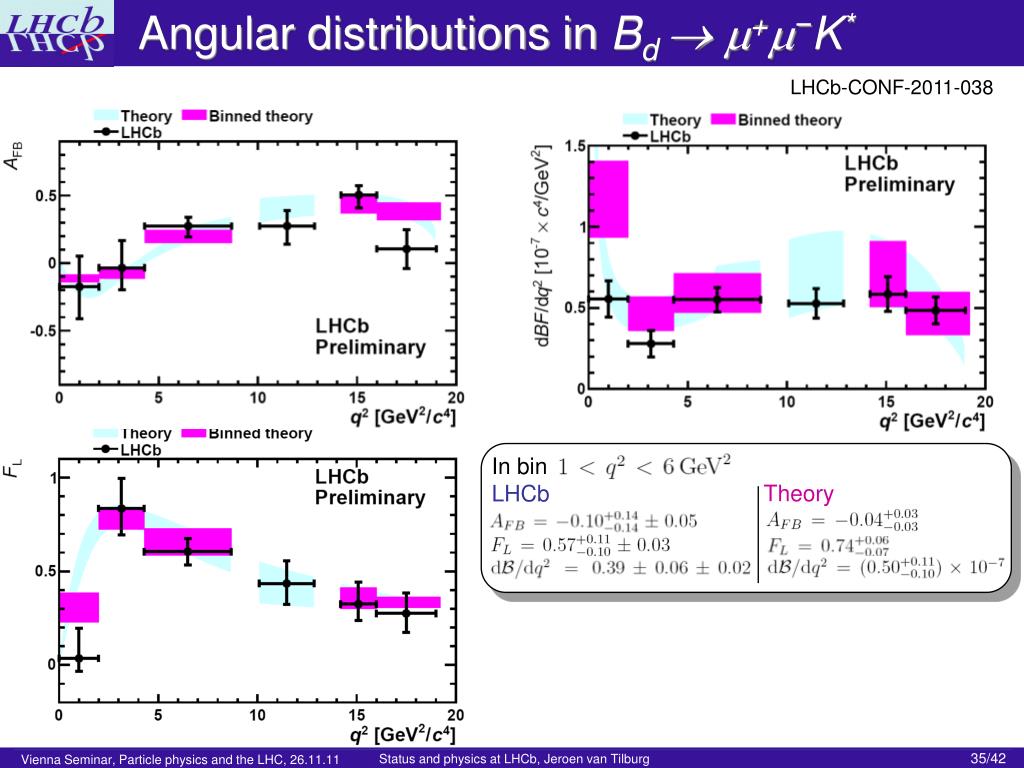 Angular distributions in Bd +−K* In bin LHCb Theory LHCb-CONF-2011-038 Status and physics at LHCb, Jeroen van Tilburg
