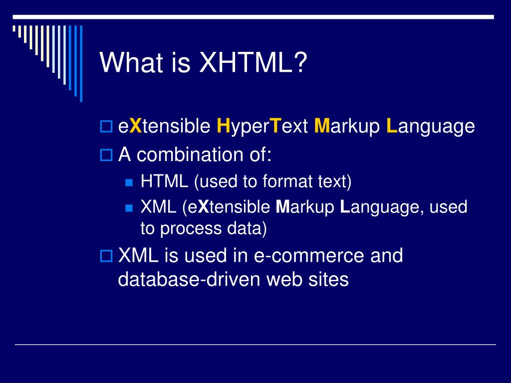 What is XHTML? • eXtensible HyperText Markup Language • A combination of: • HTML (used to format text) • XML (eXtensible Markup Language, used to process data) • XML is used in e-commerce and database-driven web sites