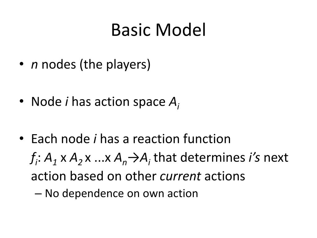 Basic Model • n nodes (the players) • Node i has action space Ai • Each node i has a reaction function fi: A1 x A2 x ...xAn→Ai that determines i’s next action based on other current actions • No dependence on own action