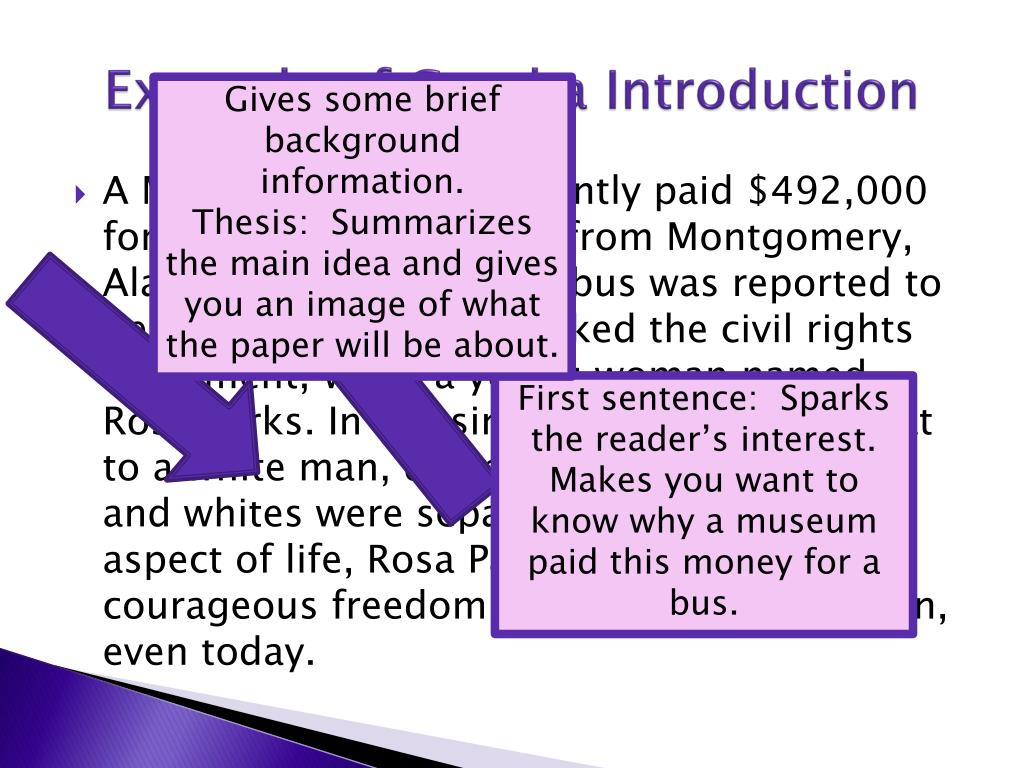 Example of Good a Introduction Gives some brief background information. Thesis: Summarizes the main idea and gives you an image of what the paper will be about. • A Michigan museum recently paid $492,000 for an old, rundown bus from Montgomery, Alabama. The old yellow bus was reported to be the very one that sparked the civil rights movement, when a young woman named Rosa Parks. In refusing to surrender her seat to a white man, during a time when blacks and whites were separated in almost every aspect of life, Rosa Parks inspired a courageous freedom movement that lives on, even today. First sentence: Sparks the reader’s interest. Makes you want to know why a museum paid this money for a bus.