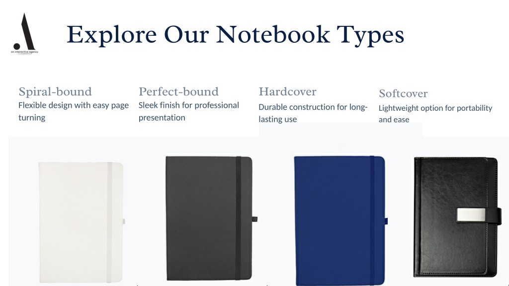 Explore Our Notebook Types Spiral-bound Flexible design with easy page turning Perfect-bound Sleek finish for professional presentation Hardcover Durable construction for long- lasting use Softcover Lightweight option for portability and ease