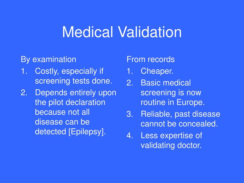 By examination Costly, especially if screening tests done. Depends entirely upon the pilot declaration because not all disease can be detected [Epilepsy]. From records Cheaper. Basic medical screening is now routine in Europe. Reliable, past disease cannot be concealed. Less expertise of validating doctor. Medical Validation