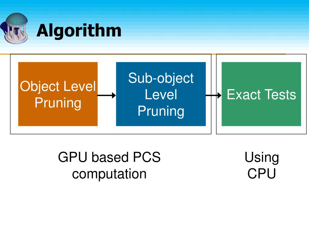 GPU based PCS computation Using CPU Algorithm Object LevelPruning Sub-objectLevelPruning Exact Tests